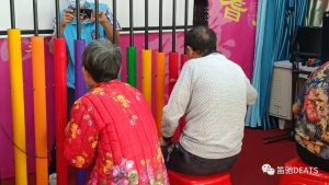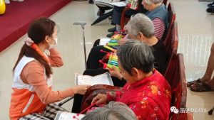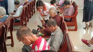 緊接著,我們還進(jìn)行了一個(gè)有趣的游戲互動(dòng)——擊鼓傳花。老人們圍著半圓坐下,志愿者負(fù)責(zé)打鼓,聲響傳花,聲停花止?;湓谡l(shuí)手中,誰(shuí)就是幸運(yùn)兒。志愿者便會(huì)邀請(qǐng)這位老人自我介紹并分享他的快樂(lè),有的老人非常開(kāi)朗,站起身來(lái)為大家表演了一段樂(lè)器;